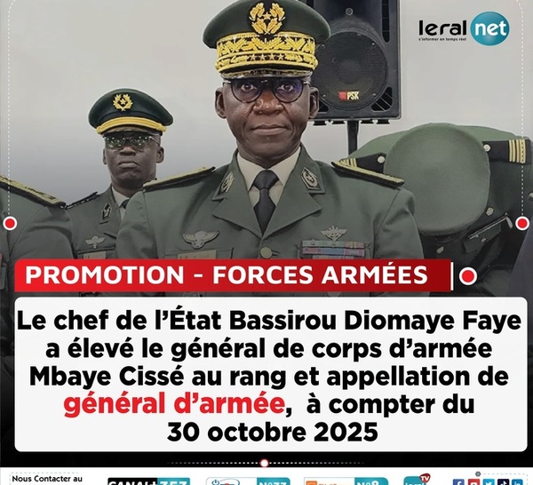 Par décret présidentiel signé le 15 octobre 2025, le chef de l’État Bassirou Diomaye Faye a élevé le Général de corps d’armée Mbaye Cissé au rang et appellation de Général d’Armée, à compter du 30 octobre 2025, selon des informations exclusives de FDS TV. Nommé chef d’État-major général des...