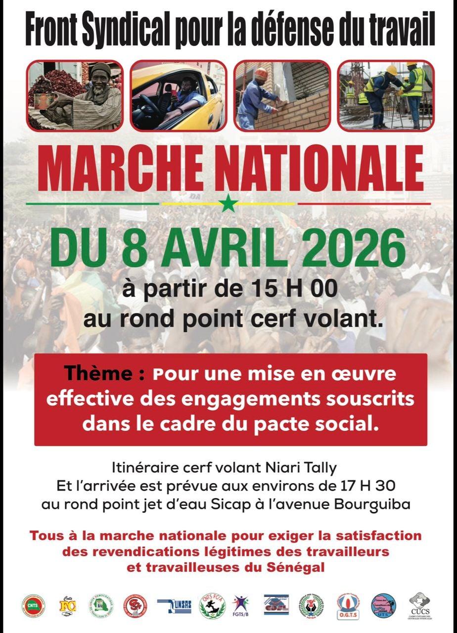 Le retard dans la mise en œuvre du pacte social pousse les syndicats à appeler à une marche nationale le 8 avril à Dakar. Le Front syndical pour la défense du travail prévoit un rassemblement à 15 heures au rond-point du Cerf-Volant, avec un itinéraire allant jusqu’au rond-point Jet d'eau.