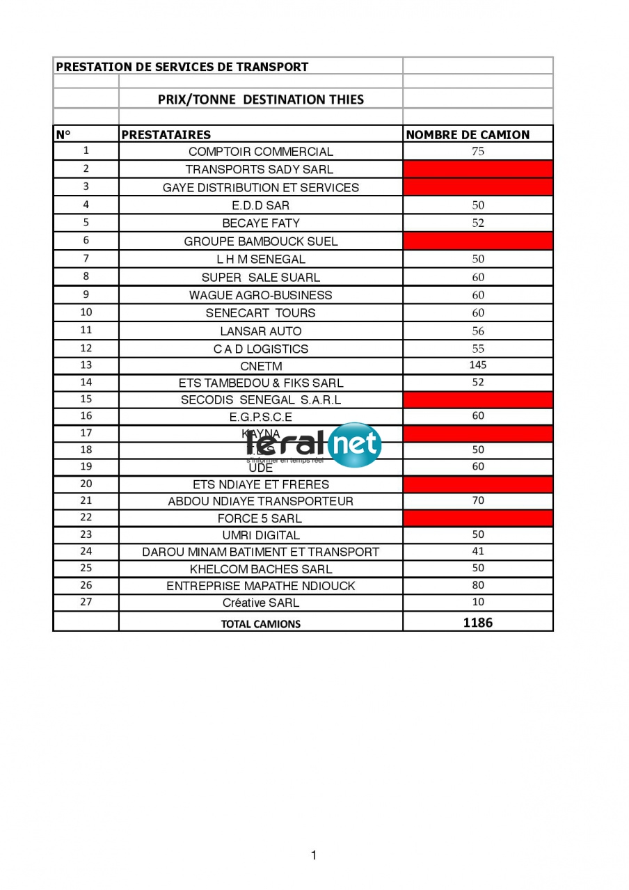 Abordant le transport des denrées vers les régions, la note informe qu'une base de données a été constituée à travers l'appel à commande permettant d'avoir une idée sur les meilleurs prix pratiqués sur le marché du transport. C'est à partir de cette base qu'un tarif a été fixé pour chaque région, renchérit le document consulté par Dakaractu.