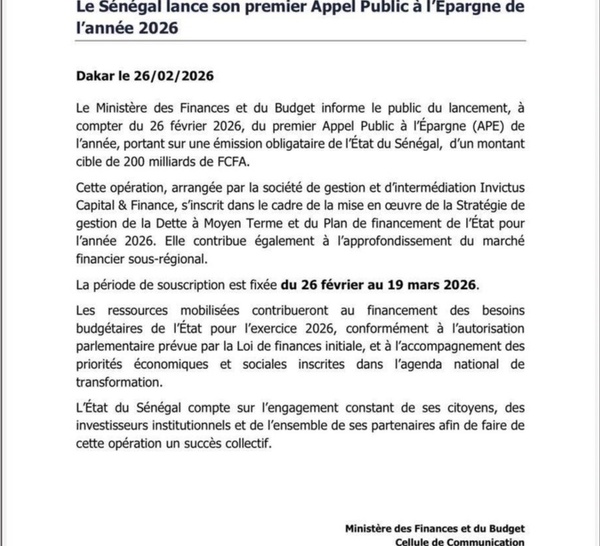 Le Ministère des Finances et du Budget informe le public du lancement, à compter du 26 février 2026, du premier Appel Public à l'Épargne (APE) de l'année, portant sur une émission obligataire de l'État du Sénégal, d'un montant cible de 200 milliards FCfa.  Cette opération, arrangée par la...